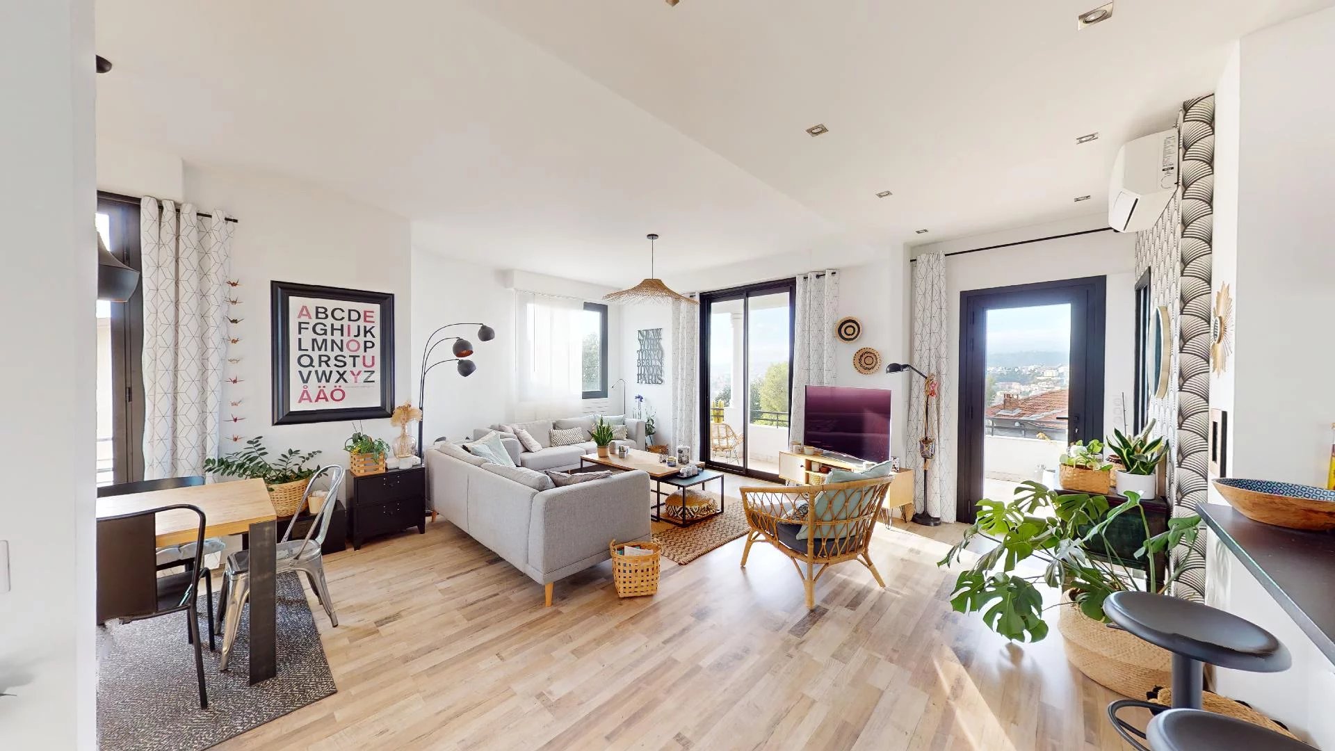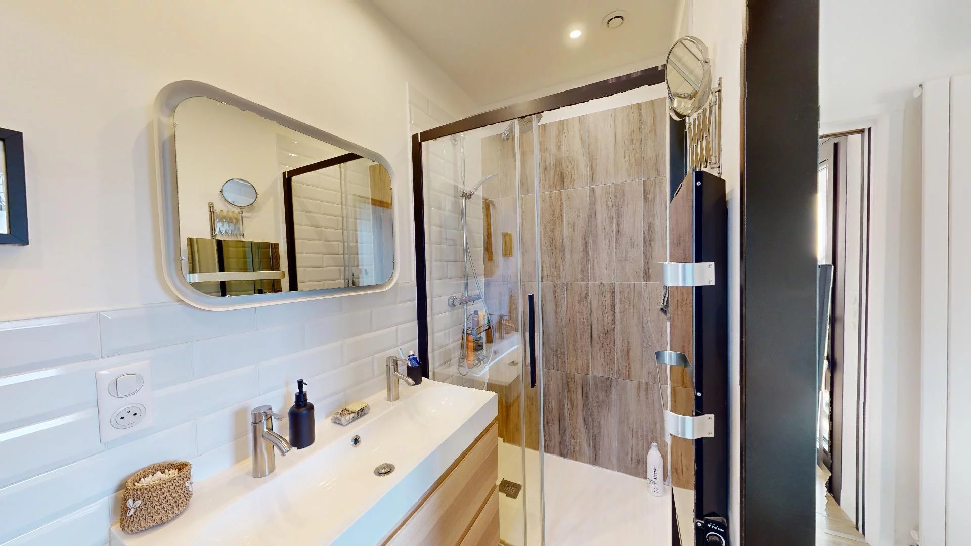 On the first floor: A pleasant and spacious living room of 48m2 with dining room and fitted and equipped US kitchen enjoying a triple exposure (South / East / West), a master bedroom with storage cupboard giving access to a pretty room water with walk-in shower, double sinks and wall-hung W.C.