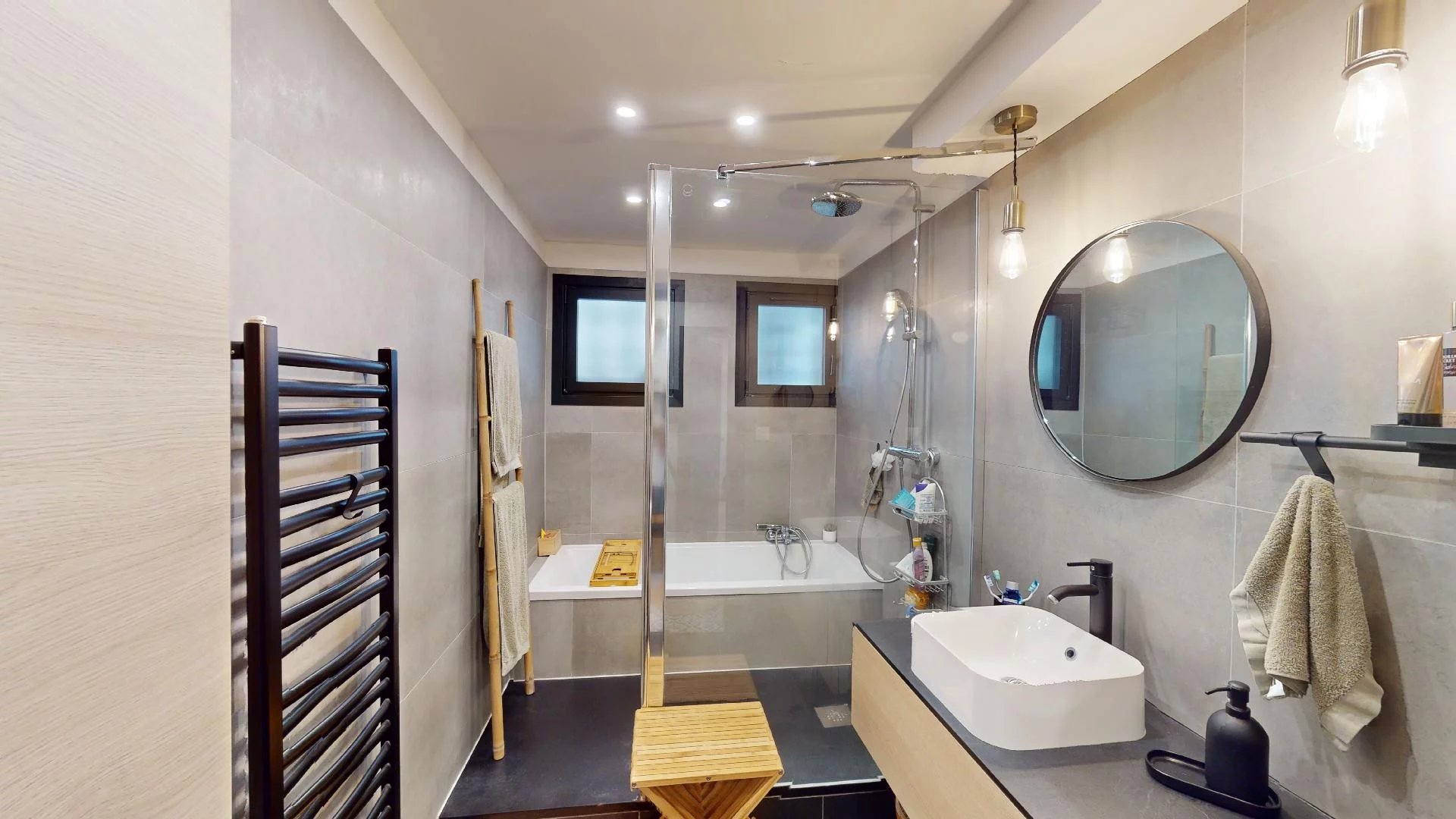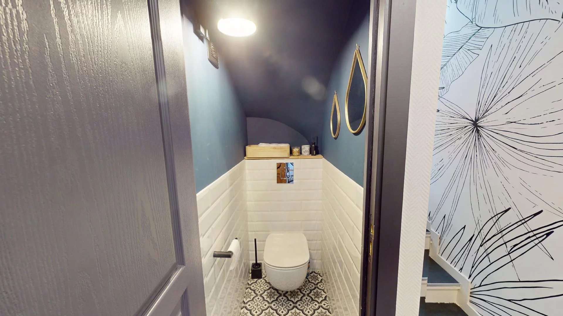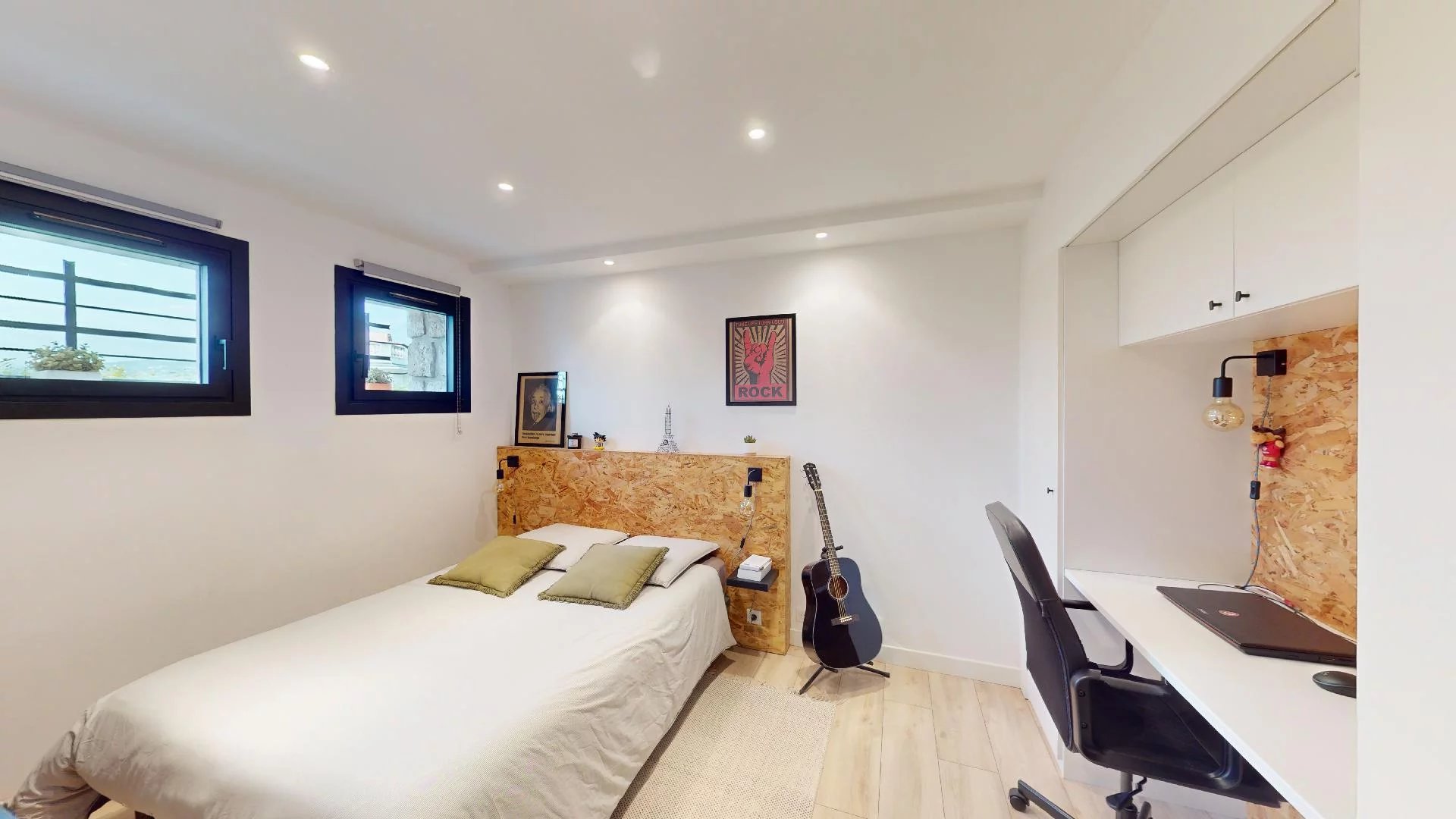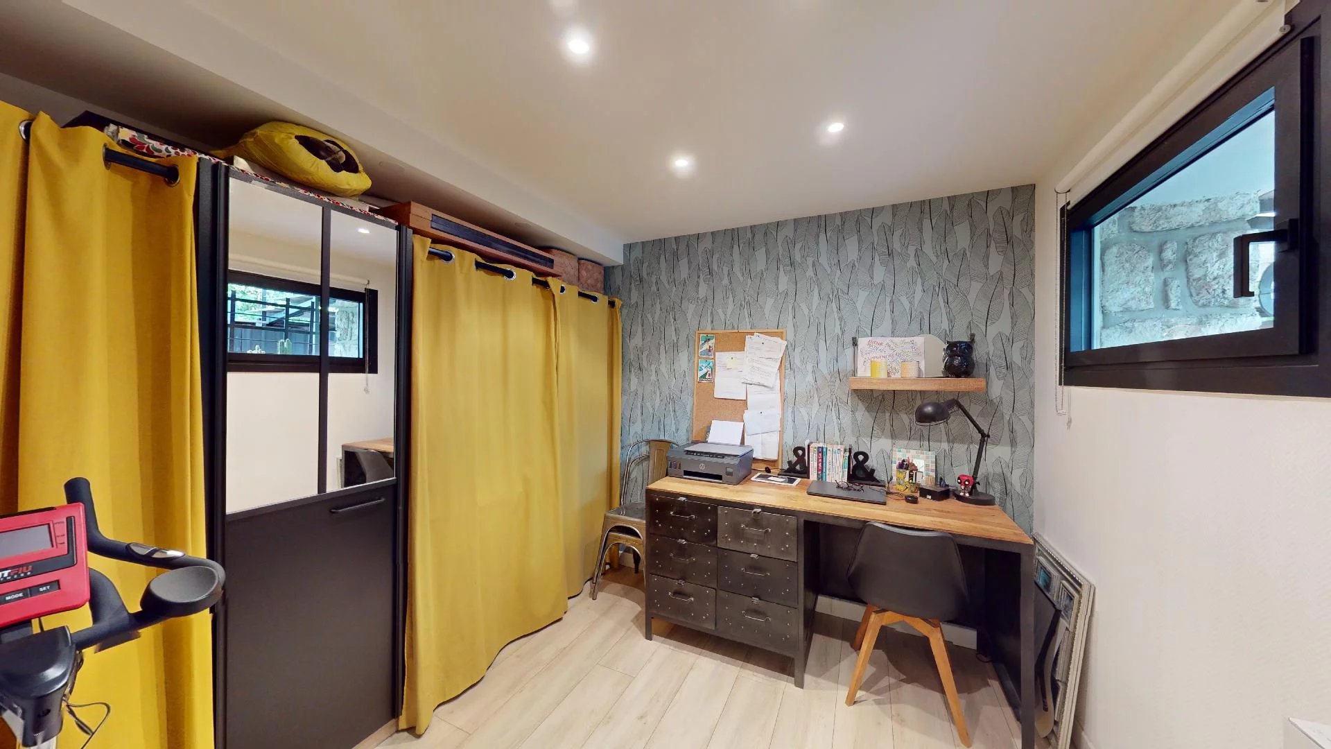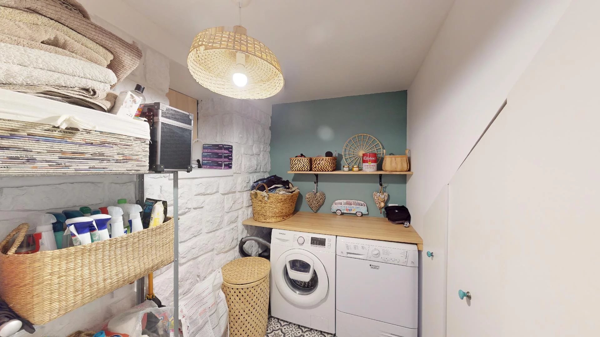 On the ground floor: Three bedrooms with storage cupboards, one of which gives access to the garden, a bathroom with walk-in shower and bathtub, a laundry room and a separate suspended toilet.