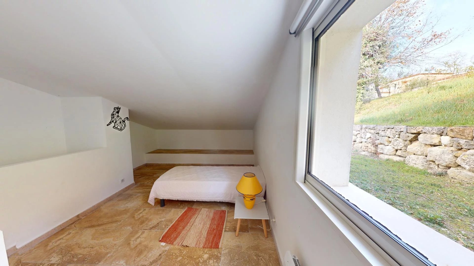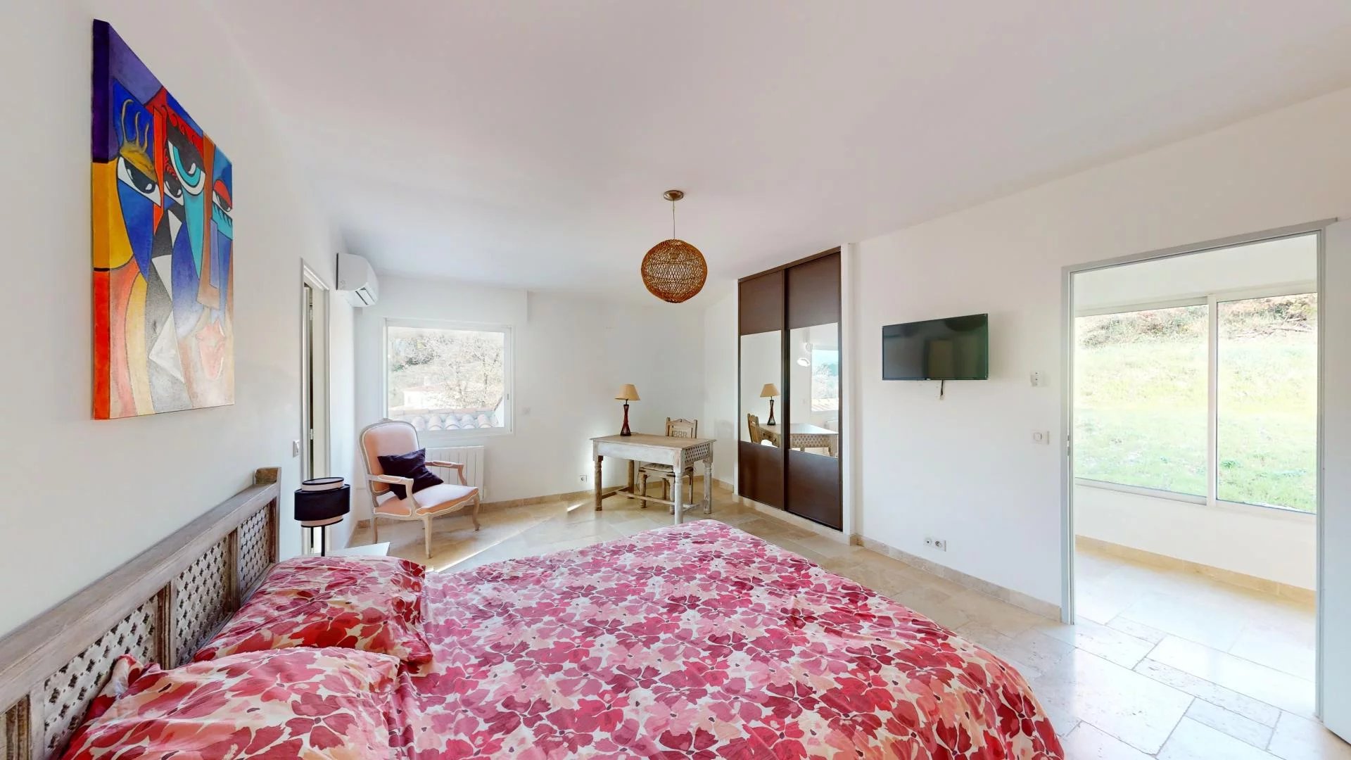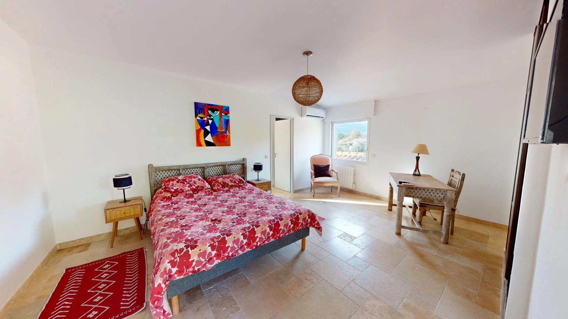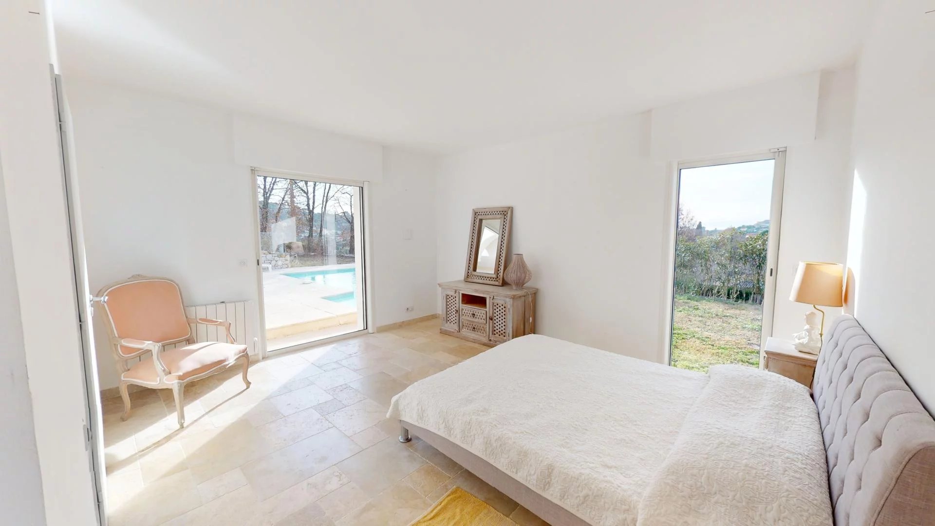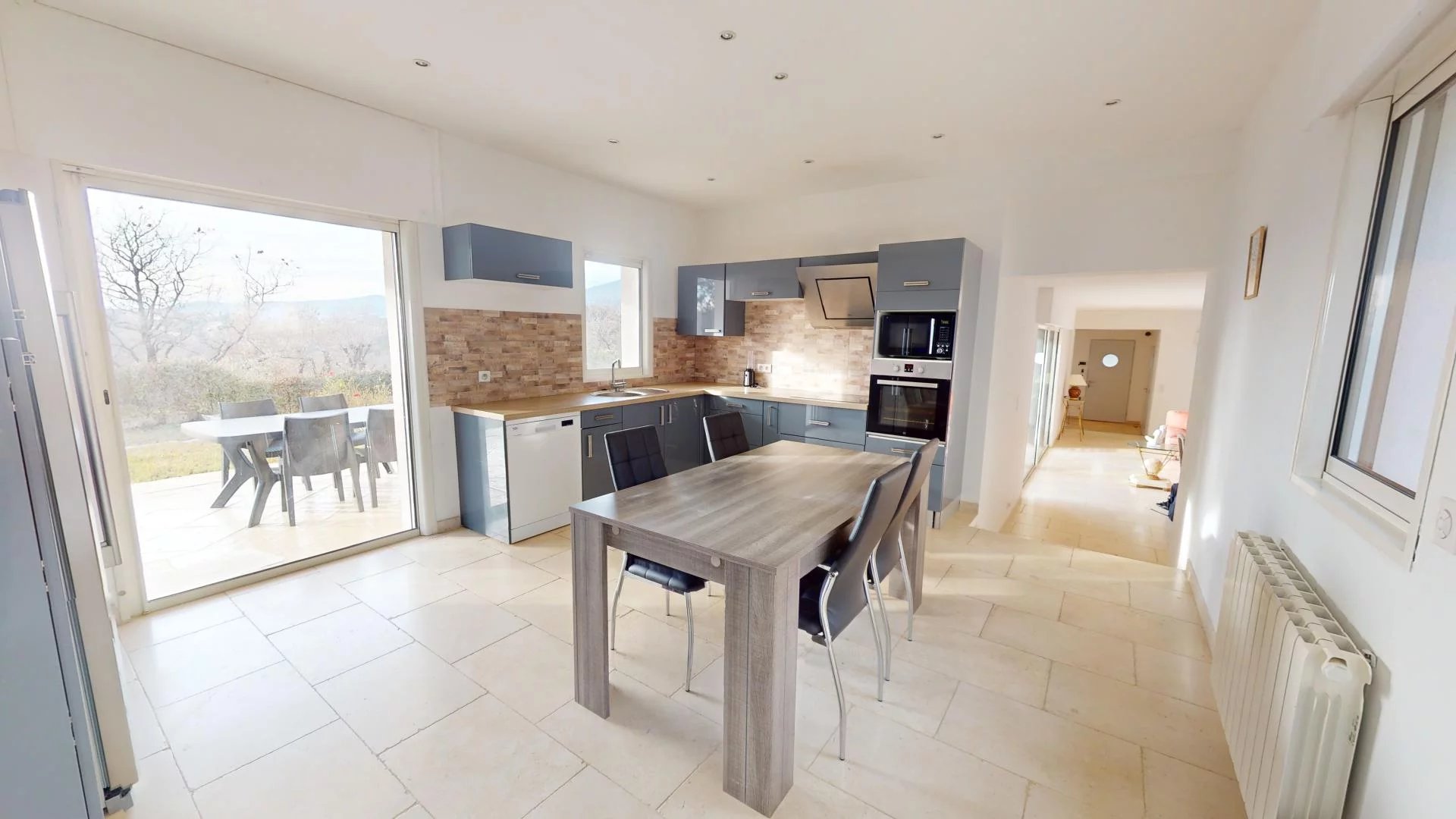 Au rez-de-chaussée : une chambre de 21m2, donnant directement sur le jardin et la piscine. Chambre qui possède sa propre salle de bains avec une grande douche à l'italienne et un placard de rangement. Egalement un magnifique salon/séjour de 43m2 avec cheminée à insert donnant sur le jardin, la piscine et une vue imprenable sur les montagnes et le village. Vous y découvrirez également une grande cuisine américaine entièrement équipée avec un accès terrasse extérieure couverte.