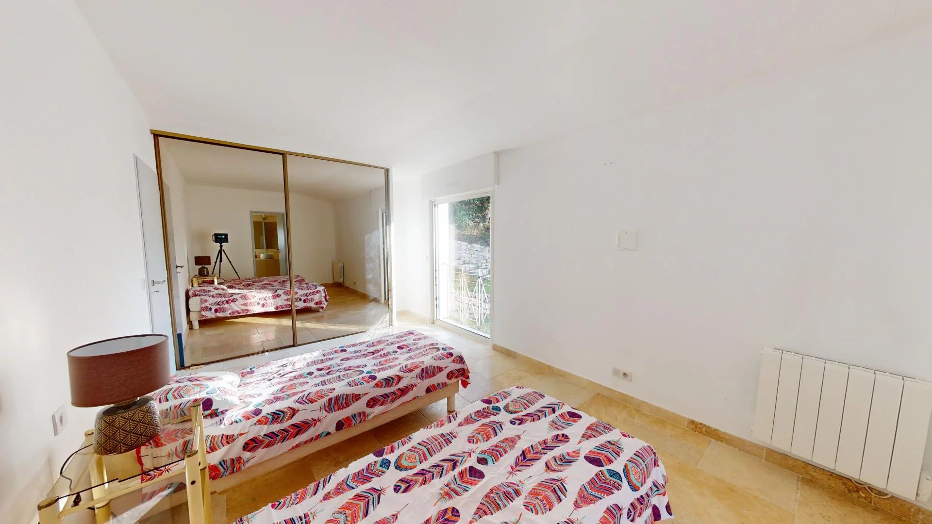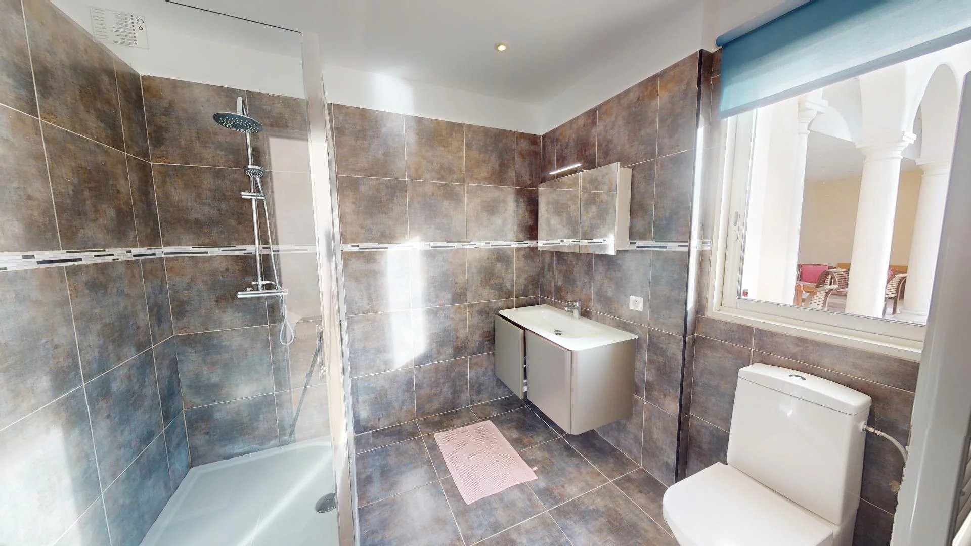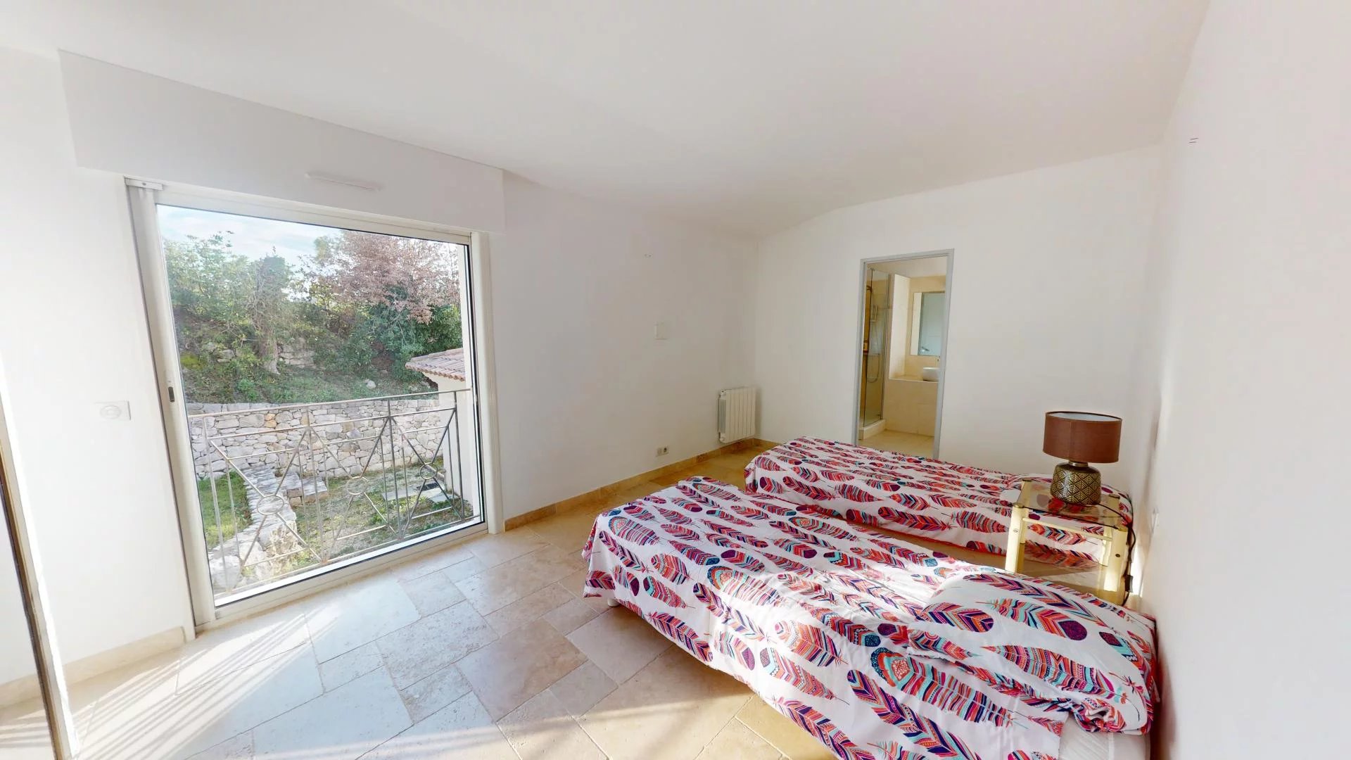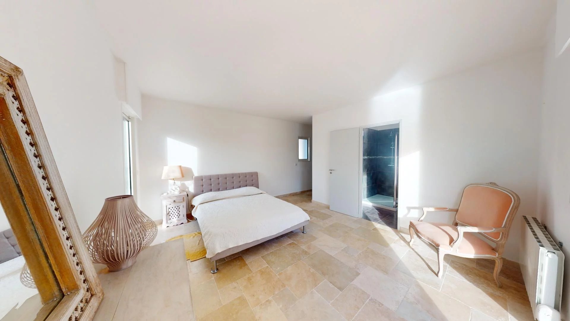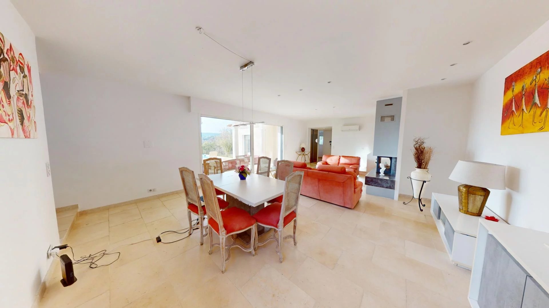 Au rez-de-chaussée : une chambre de 21m2, donnant directement sur le jardin et la piscine. Chambre qui possède sa propre salle de bains avec une grande douche à l'italienne et un placard de rangement. Egalement un magnifique salon/séjour de 43m2 avec cheminée à insert donnant sur le jardin, la piscine et une vue imprenable sur les montagnes et le village. Vous y découvrirez également une grande cuisine américaine entièrement équipée avec un accès terrasse extérieure couverte.